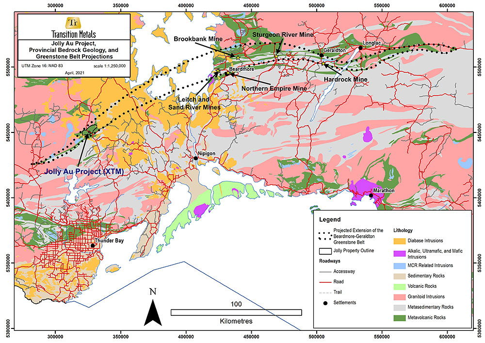 Sudbury, April 8th, 2021 - Transition Metals Corp (XTM – TSX.V) (“Transition”, “XTM”, “the Company”) is pleased to announce exploration activities commencing with a high-resolution airborne magnetic survey over its newly acquired Jolly Gold project approximately 75 kilometres north of Thunder Bay, Ontario. The Company has contracted New-Sense Geophysics Limited to conduct the 1,066 line kilometre survey at 50 metre spacing over the entire 4,560 hectare property.