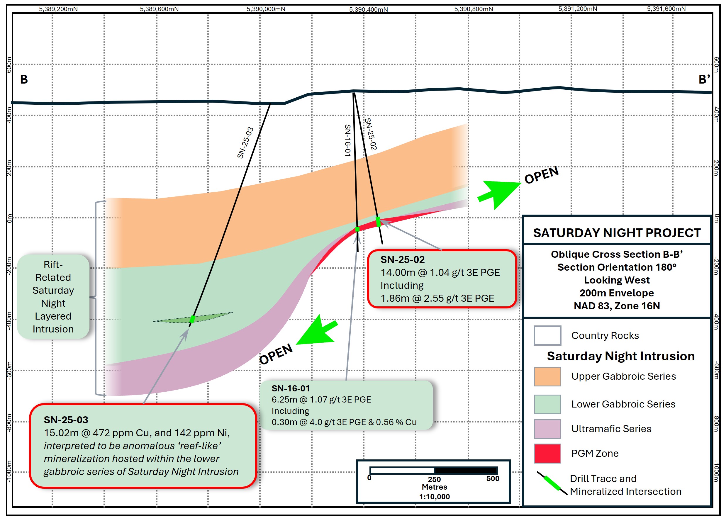 CEO Scott McLean commented, “The thick sequence of differentiated rift intrusion encountered at Saturday Night is highly encouraging. The geology, mineralization style, and geophysical characteristics are strikingly similar to those observed at the Sunday Lake and Thunder Bay North Ni-Cu-PGM deposits. With the platinum market facing a significant deficit for the third consecutive year and strong investment interest driving demand, the potential for thicker, concentrated Ni-Cu-PGM mineralization at depth becomes even more compelling. The presence of a thick layered intrusive sequence and basal cumulate phases intersected in these three holes further supports this potential. We look forward to resuming drilling, following up on deeper mineralization intersections in hole SN-25-03 once funding is secured.”