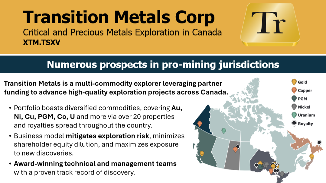 Transition's multi-commodity focus reduces the company's exposure to commodity market swings and broadens its attractiveness to funding partners. Transition has assembled a large and growing multi-commodity portfolio of more than 20 projects in some of Canada's best known and emerging mining districts.