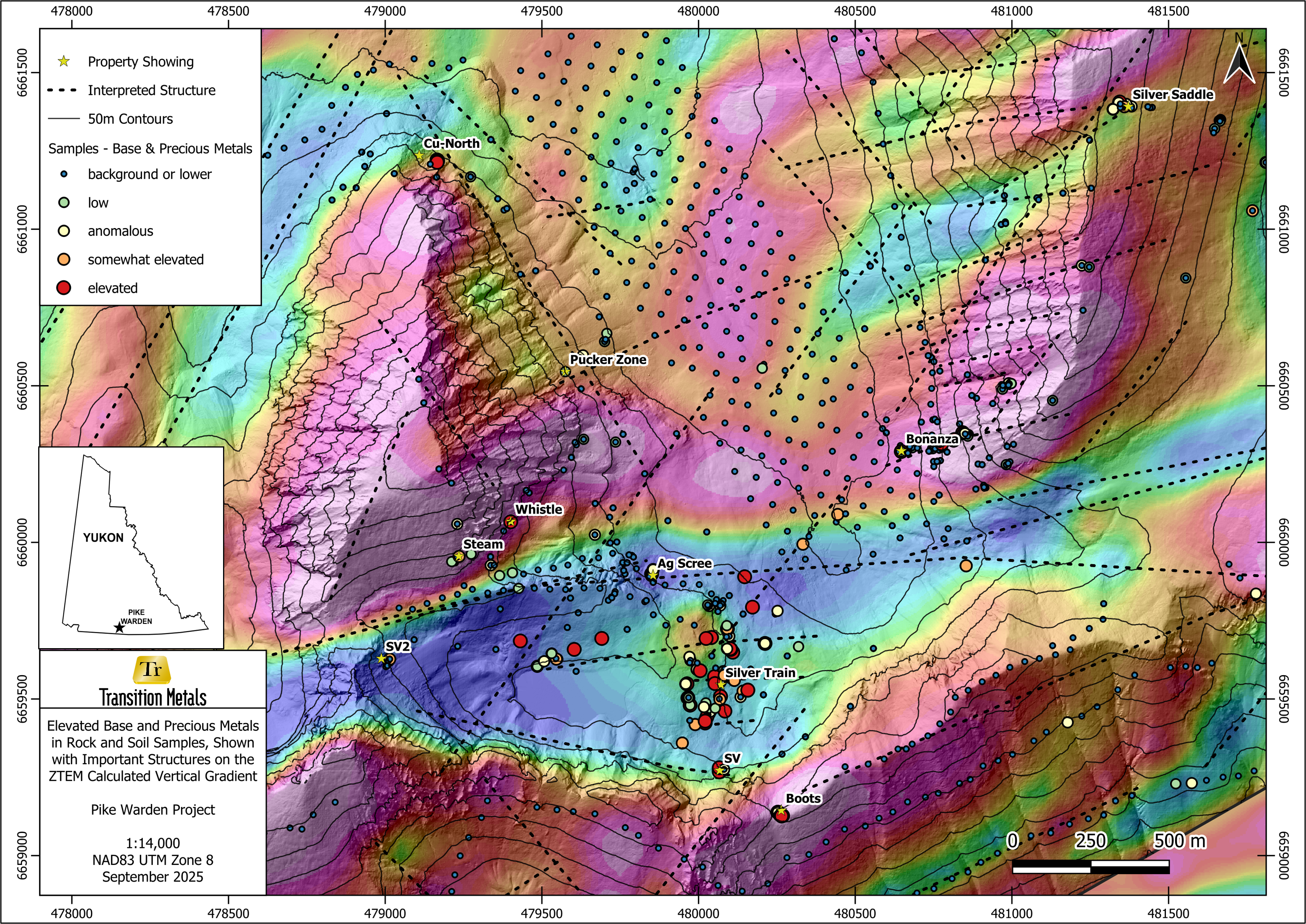 Figure 1: Map of the Copper Junction target area, Pike Warden property, illustrating major interpreted structures and areas of elevated base and precious metals, displayed on a background of the calculated vertical gradient from the 2024 ZTEM survey.